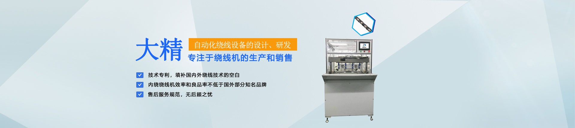 上海大精电子科技有限公司成立于 2013 年,位于上海市松江区。公司现拥有超过 300 平米的科研中心。拥有专业的绕线机、自动化生产线相关专业的设计及加工制作团队。专为扩大产能需求,2022年青岛工厂正式投产。 公司主要从事自动化绕线设备的设计、研发,在微电子绕线领...